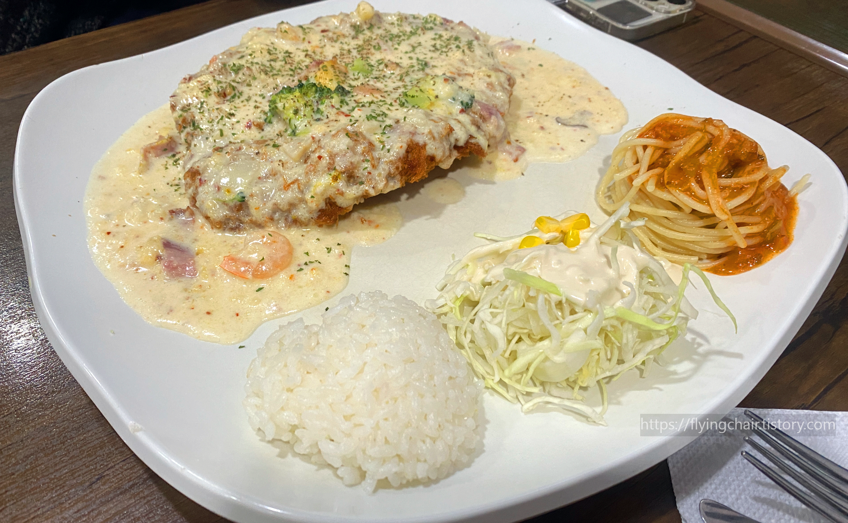 크리미한 까르보나라 파스타 소스를 돈까스에 뿌린 맛이다. 마찬가지로 고기가 신선하고 잘 튀겨졌다.